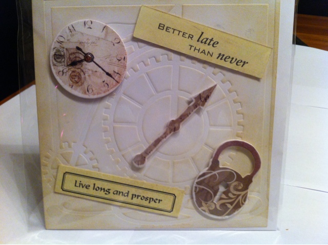 These are not the true colours of this card, I am a rotten photographer, now I know that 6p.m. on the landing are neither the time or place to take photos! There should be lots of yellow and blues in the background of the card, and it is lying on a white bedding box!